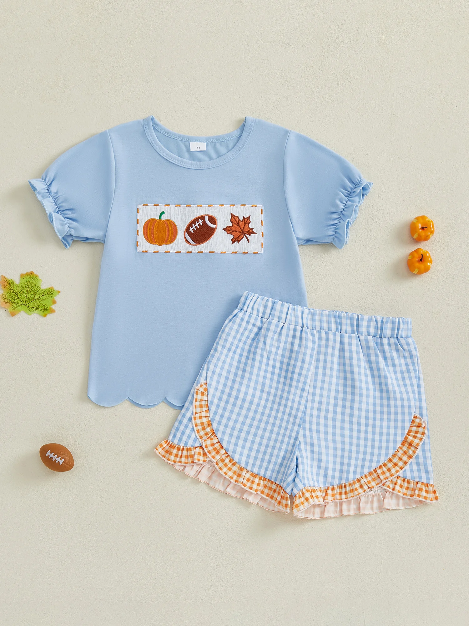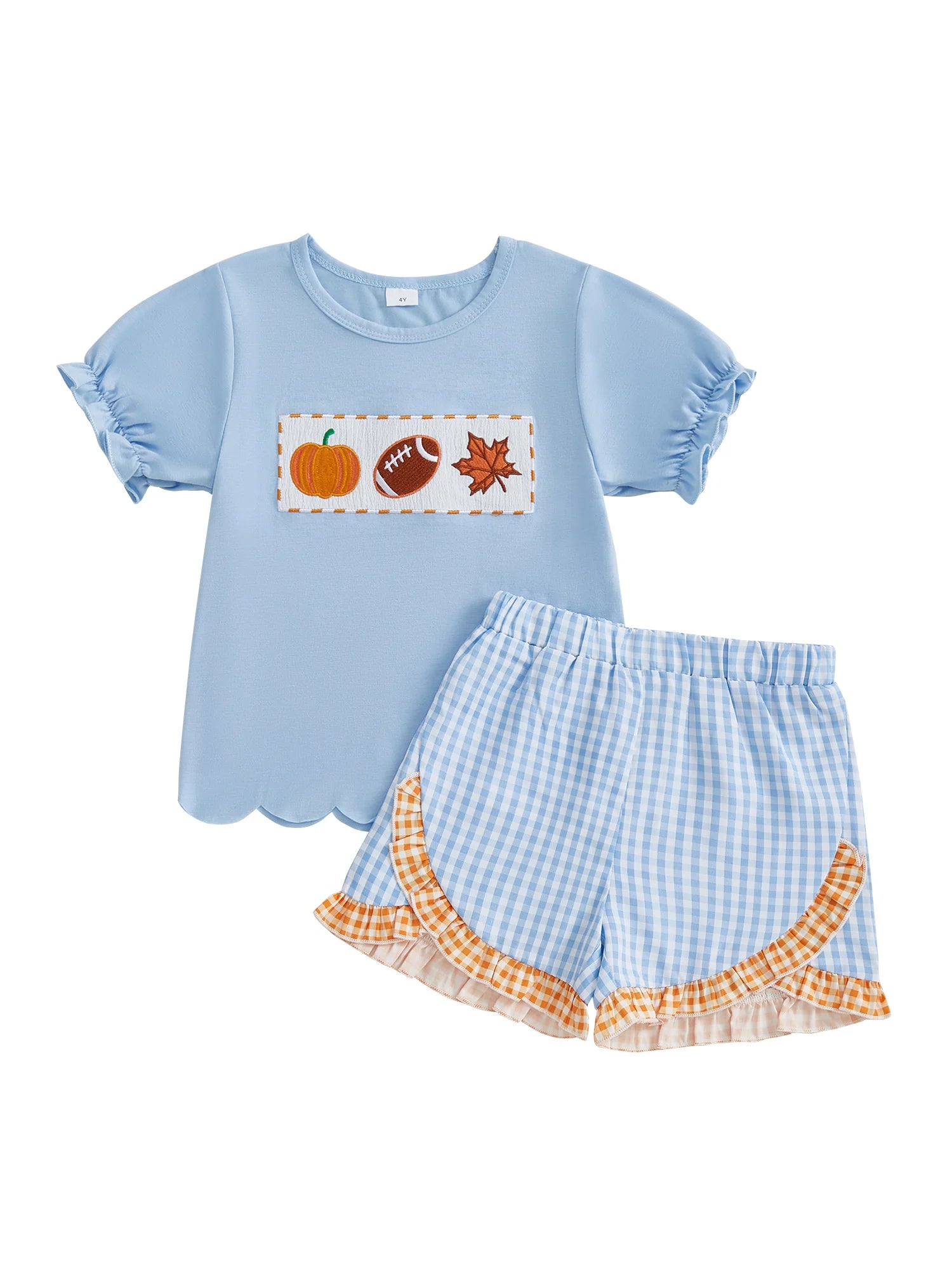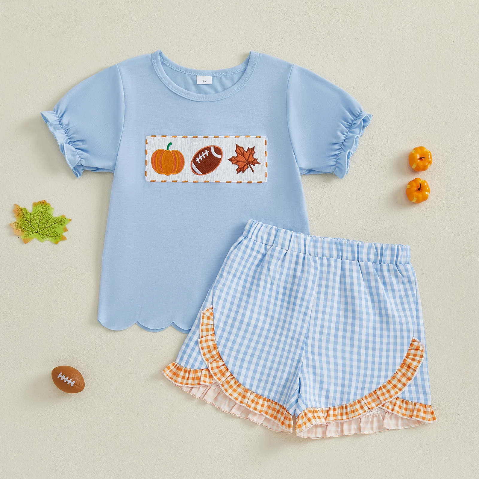 Toddler Girls Halloween Outfit Embroidery Short Sleeves T-Shirt and Elastic Plaid Ruffles Shorts Set Cute Clothes
