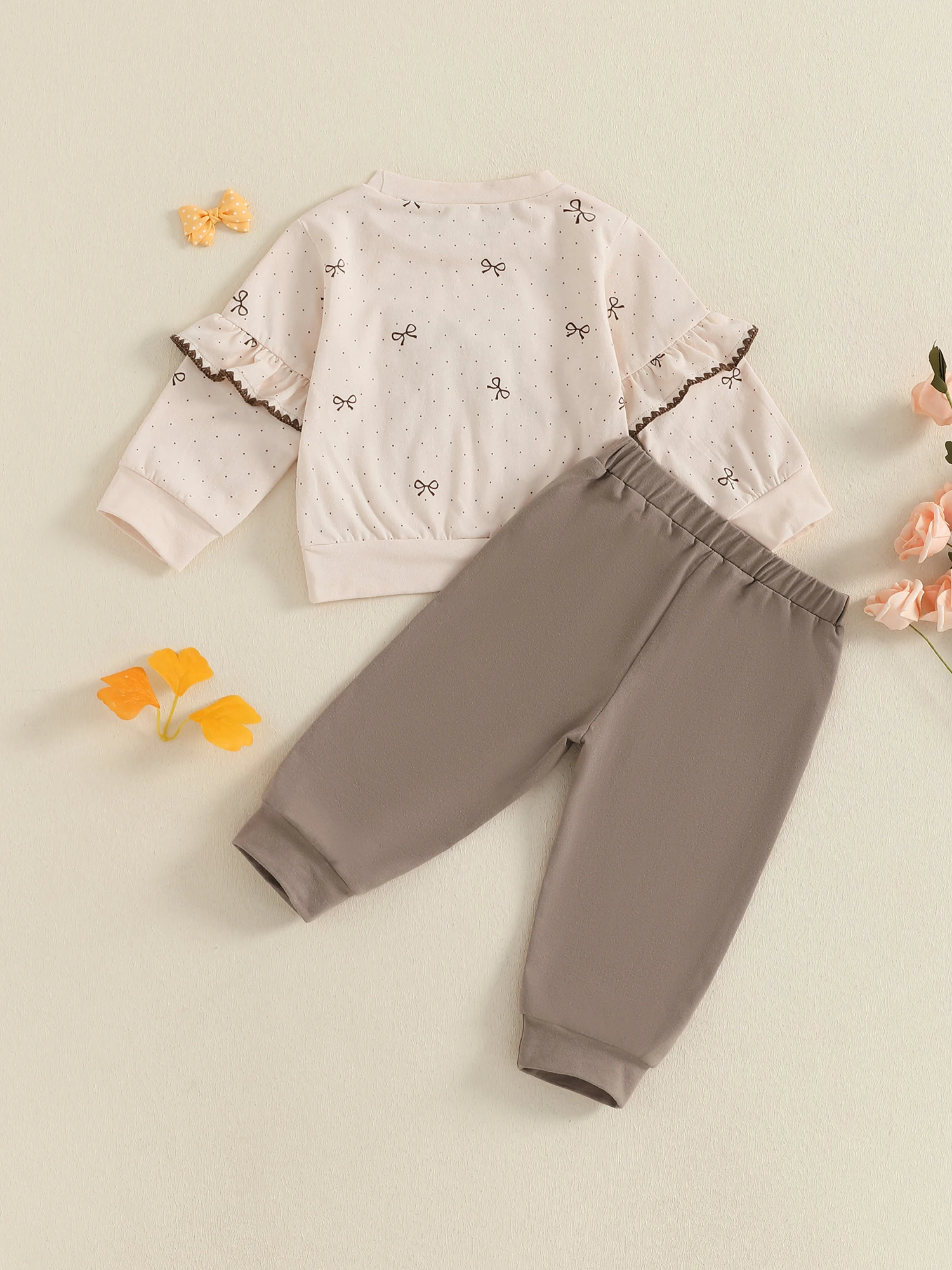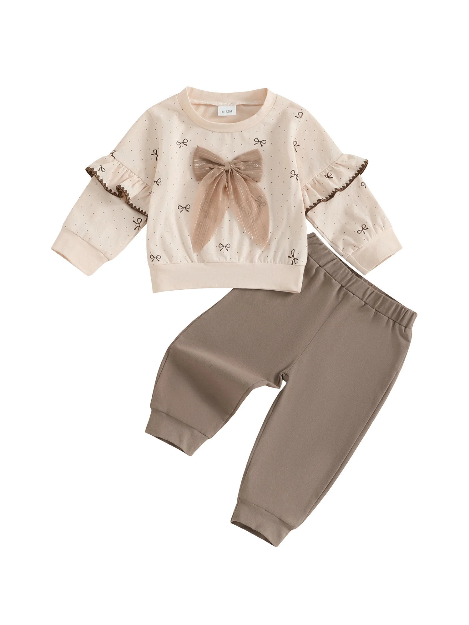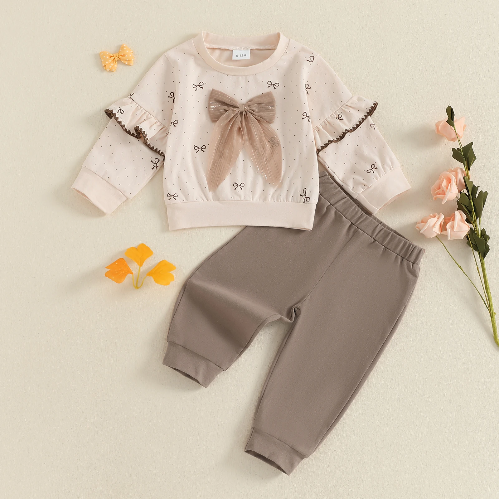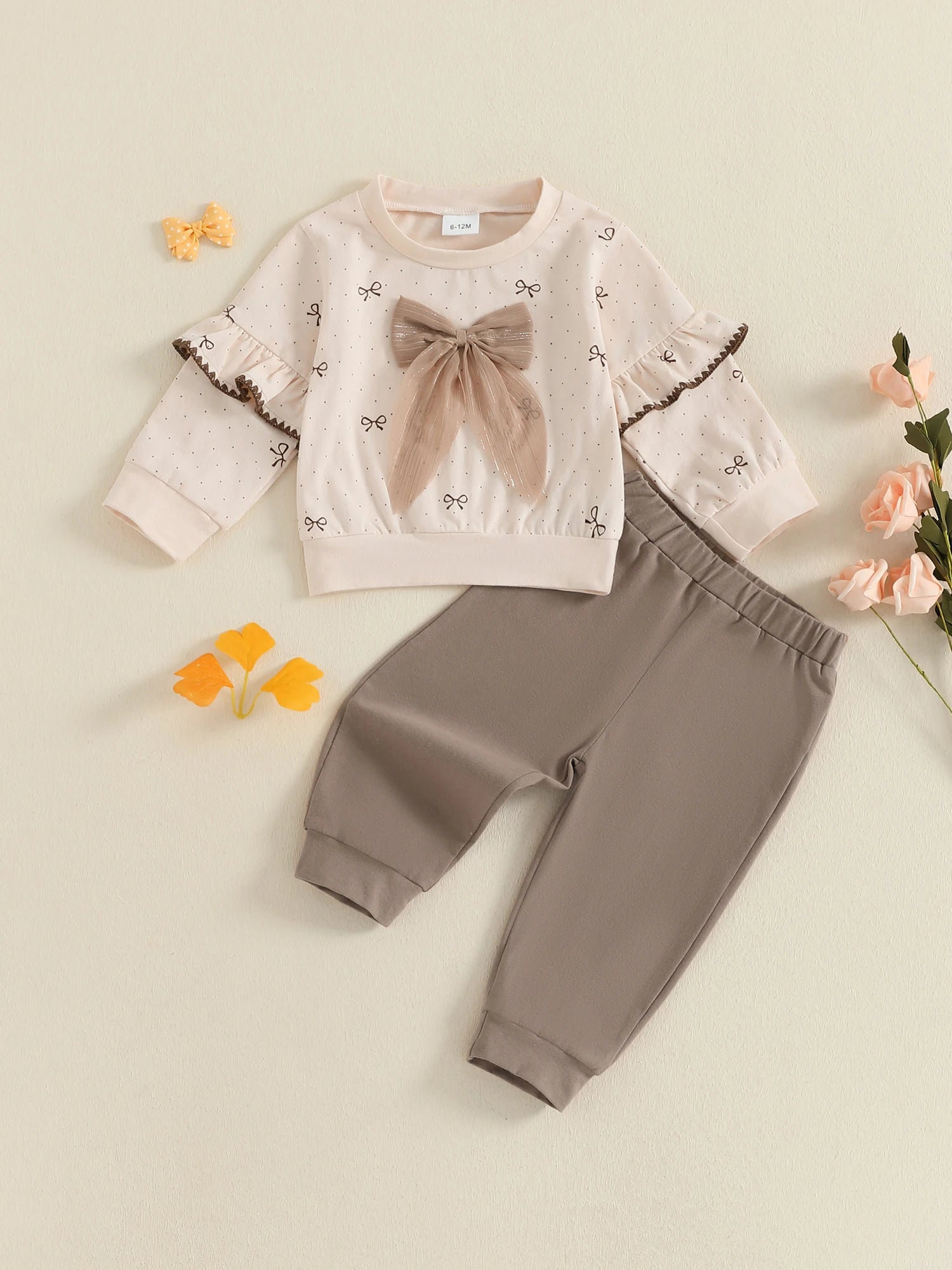 Adorable Toddler Girl Autumn Ensemble with 3D Bow Print Top and Elastic Waist Pants - 2 Piece Set for Fall Fun