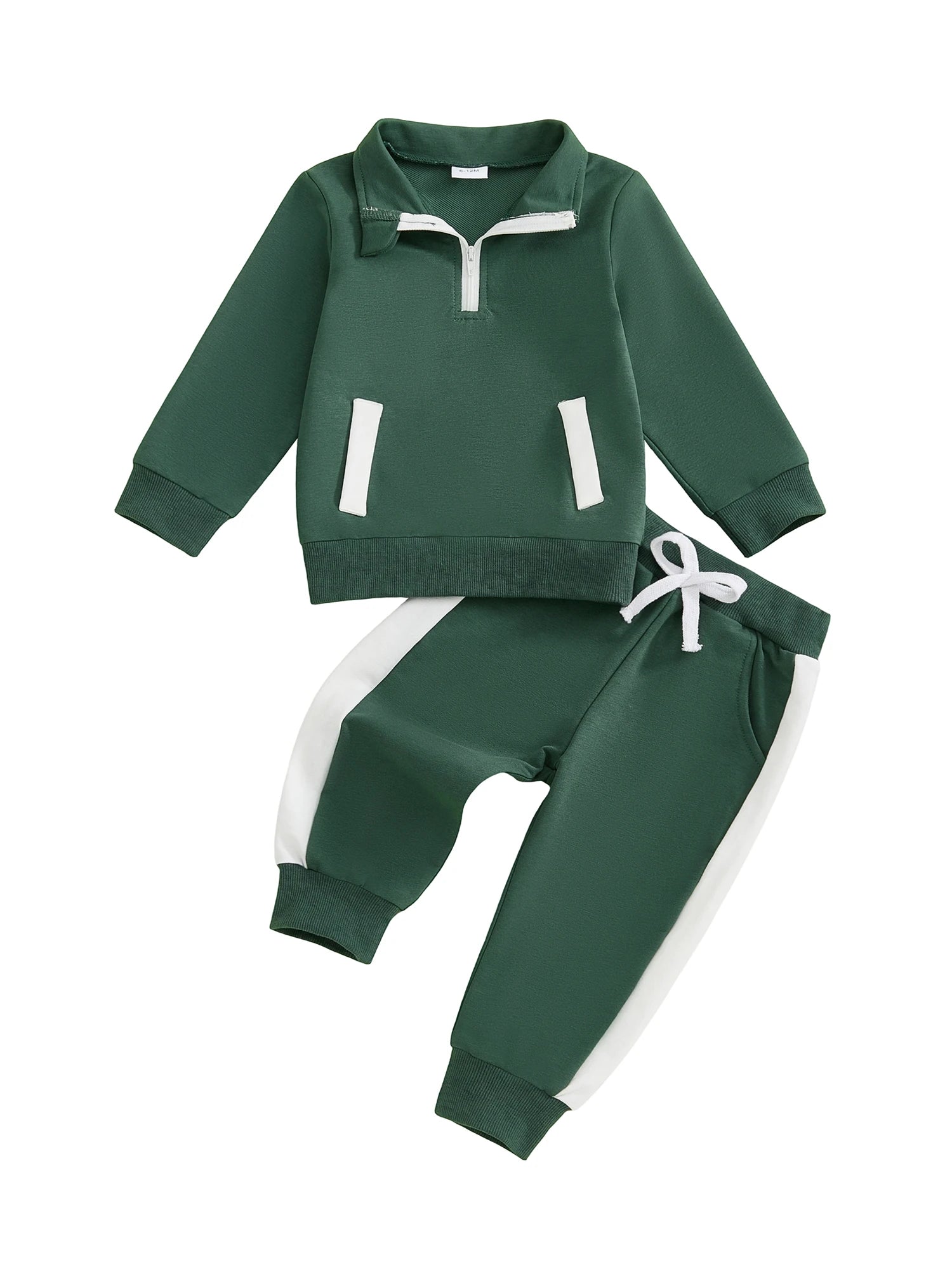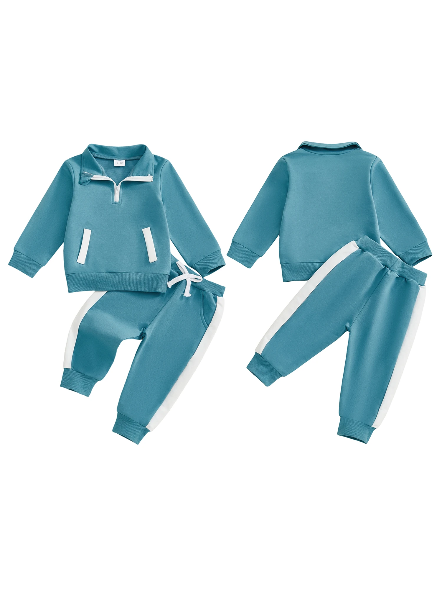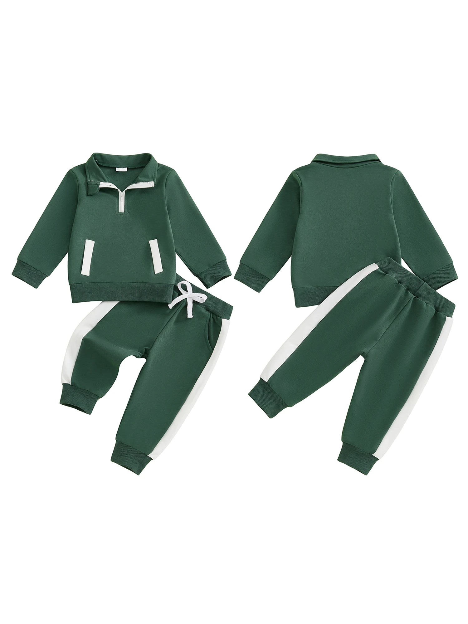 Little Boy Girl Fall Outfit Contrast Trim Half Zip-up Long Sleeve Sweatshirt and Joggers 2 Piece Set