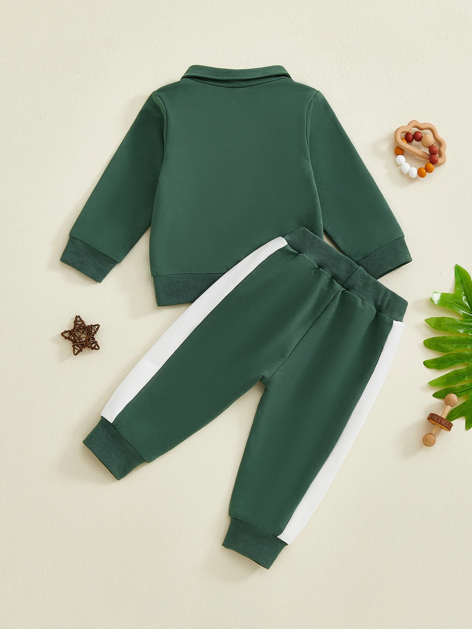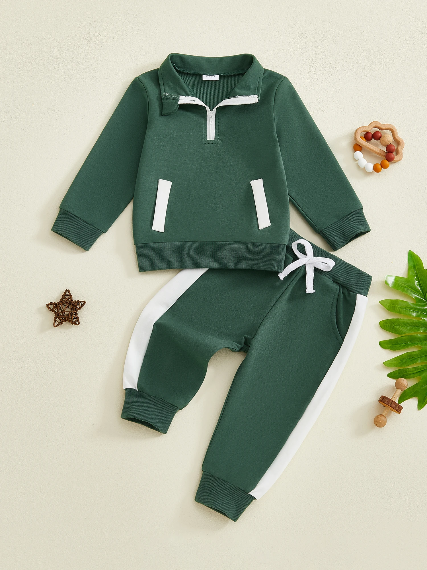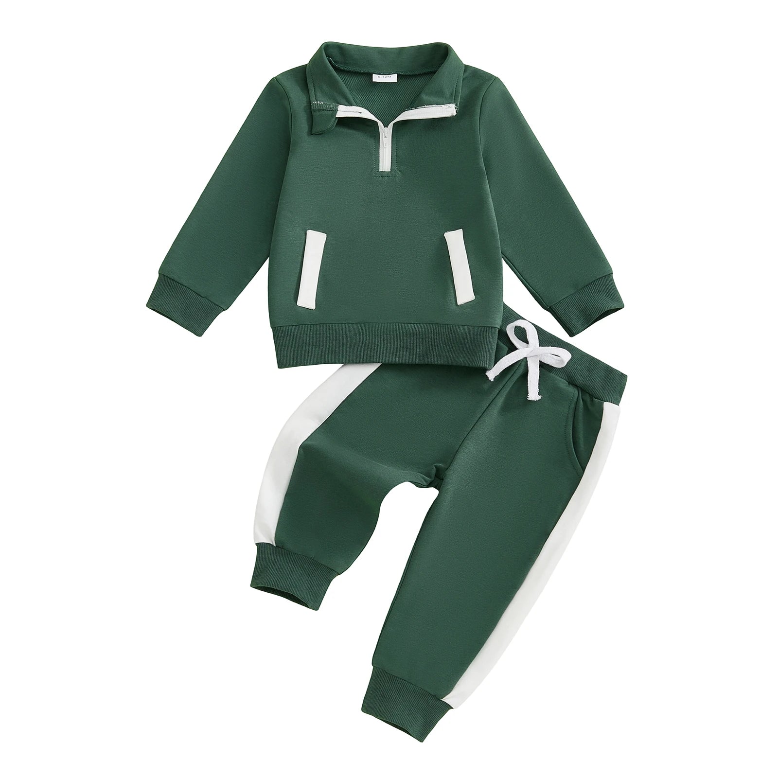 Little Boy Girl Fall Outfit Contrast Trim Half Zip-up Long Sleeve Sweatshirt and Joggers 2 Piece Set